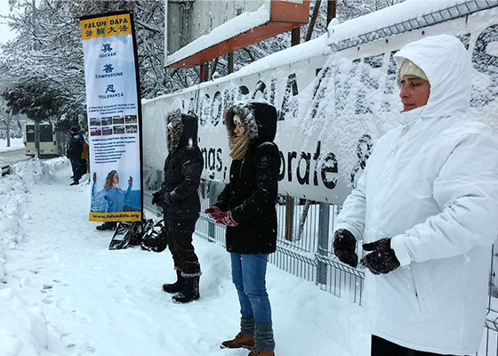 在这场风雪中有一群特殊的人吸引了人们的注意力——法轮功学员顶风冒雪在中共驻罗马尼亚大使馆前抗议中共多年来持续迫害法轮功的暴行。