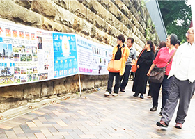 在二零一五年十月的旅游高峰期间,悉尼法轮功学员在著名的悉尼歌剧院景点帮助一位导游做了“三退”(退出中共党、团、队)。