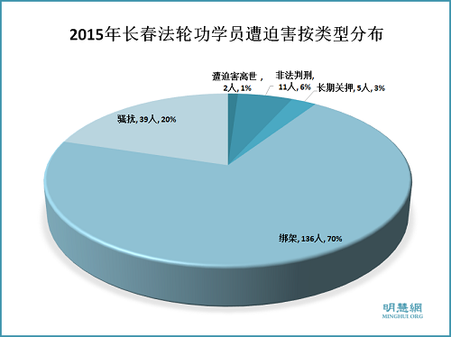 据不完全统计,2015年长春市区有两人在迫害中离世,11人被非法判刑,136人被绑架,被上门或电话骚扰远超过39人次,5人被长期关押。