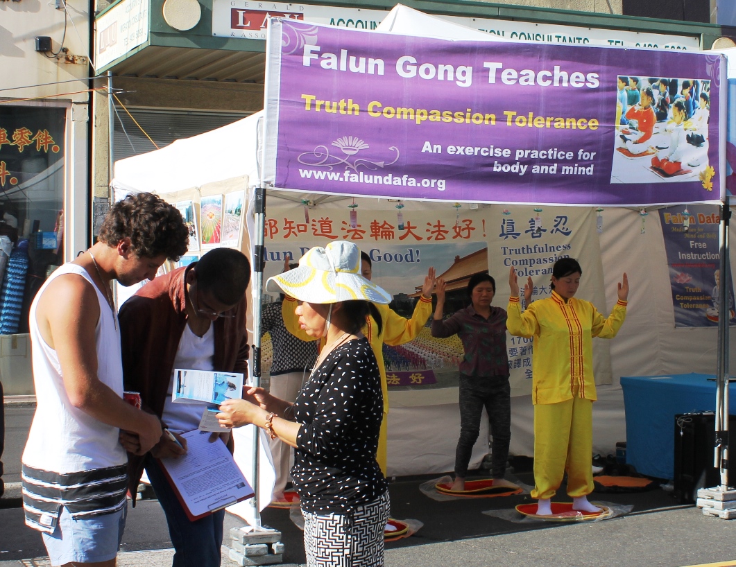 有很多人表示,看到过法轮功学员在唐人街、市中心常年讲真相,希望中共对法轮功的这场迫害早日结束,也祝福法轮功学员一切顺利。还有很多没有听说过法轮大法的人,了解到法轮功学员在中国大陆遭受的迫害都很震惊,纷纷在要求制止中共迫害的征签表上签名。还有不少民众希望在网上了解更多法轮功真相。当天几位华人在现场三退(退出中共党、团、队)。