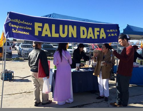 在摊位上,越南裔法轮功学员向很多说越南话的人介绍法轮功。一位男士告诉法轮功学员,他的侄女在越南修炼法轮功,并介绍他学法轮功。他看了《转法轮》的书,了解了很多真相,但一直没机会找当地的法轮功学员,这次来这里终于找到了,很高兴,他表示要去炼功点学功。