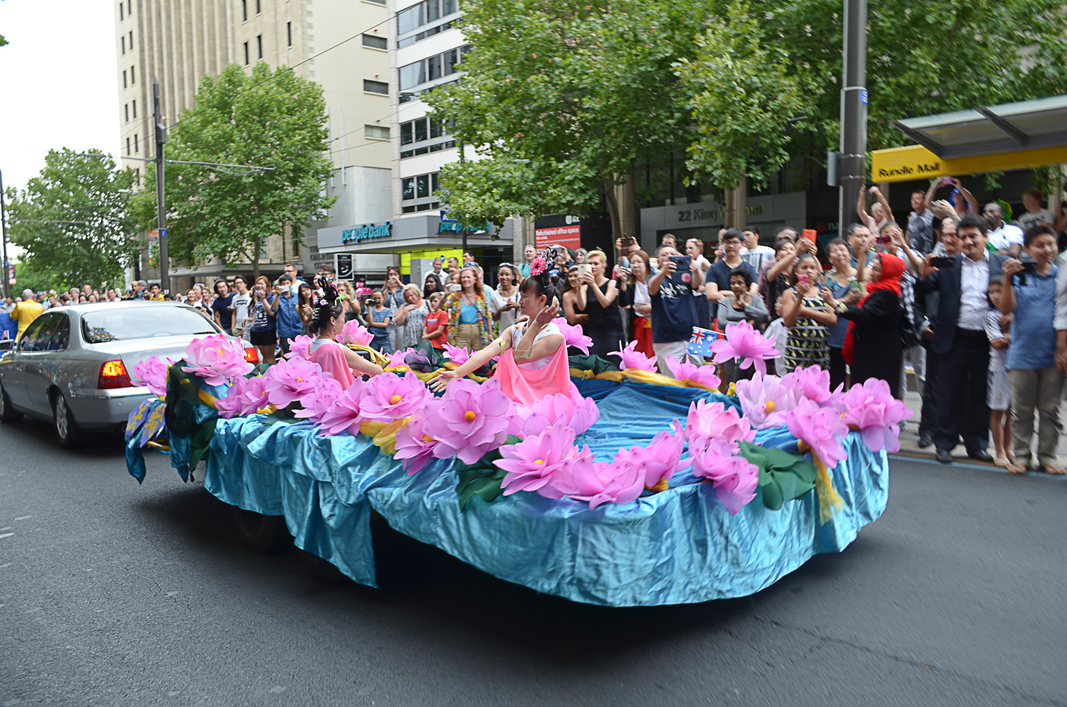 当日天气晴朗,艳阳高照,游行定在傍晚举行,来自一百五十多个社团的四千多参加游行的人们身著各种民族盛装,用花车、乐队、歌舞等方式尽情展现各自民族的文化和表达自己对澳大利亚国家的热爱及为此的贡献。代表中国的修炼文化,南澳法轮功学员的队伍展现了修炼团体的精神面貌。