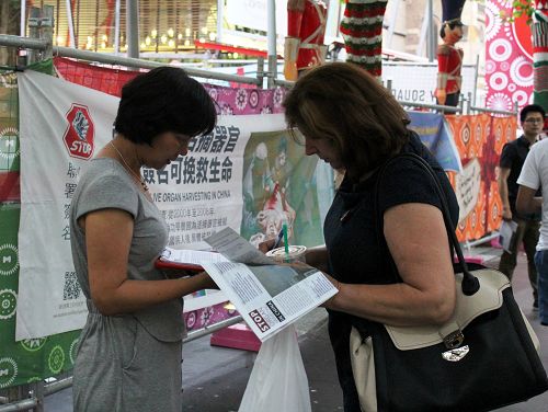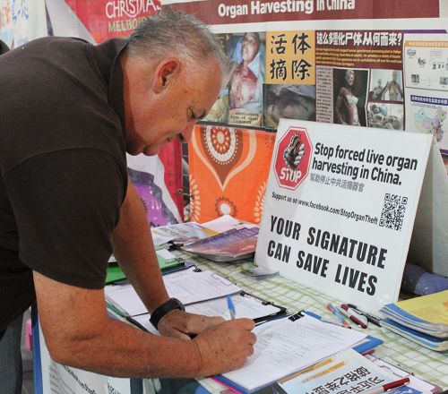 图6:苏利文(Sullivan)女士和家人来自距离墨尔本三小时车程的奥尔伯里市,她听说过法轮功,但第一次有机会签名,她说:“我希望活摘器官的暴行能尽快被制止。”