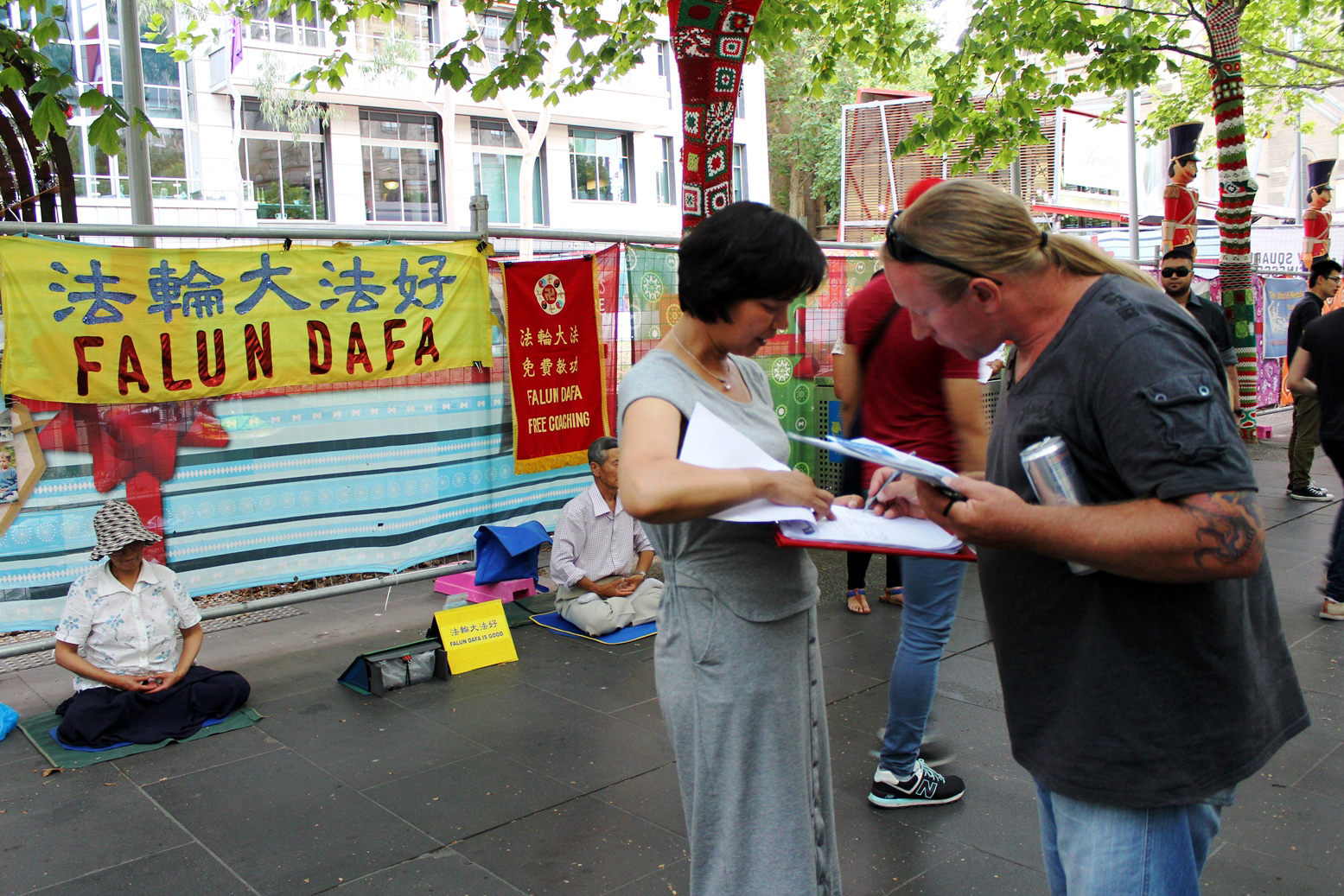 【明慧网二零一六年一月三日】(明慧记者夏纯清墨尔本报道)二零一五年的最后一天,墨尔本部分法轮功学员按照往年的惯例,在市中心城市广场前,竖起真相横幅,展示五套功法,向市民和游客讲述十六年来法轮功反迫害的真相,征集签名制止活摘器官的罪恶、举报迫害元凶江泽民。