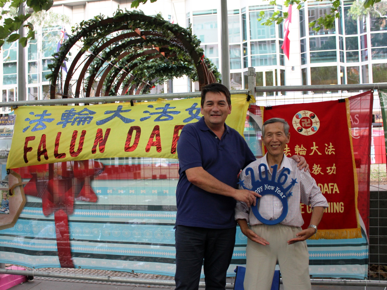 图7:来自悉尼的游客贝伊斯(Mick Bayiis)先生和法轮功学员合影。