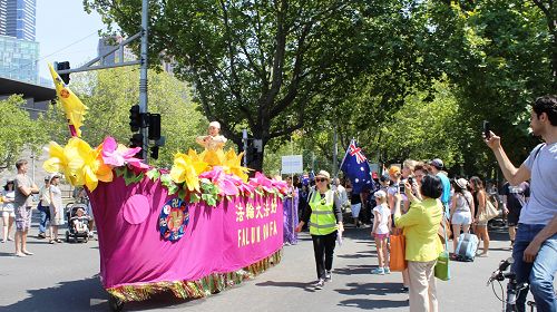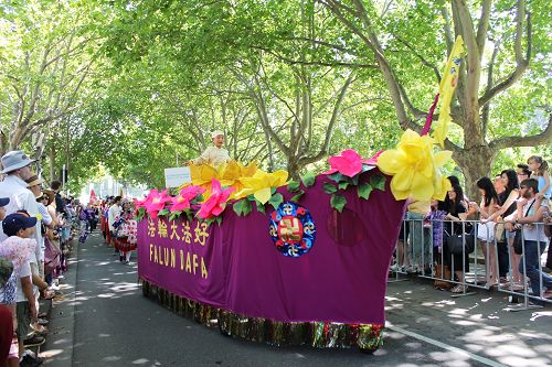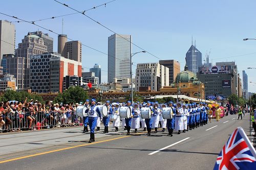 游行主办方在大街的各个路段安装了智能接力音响设备,观众无论在大街的任何位置,都能清晰的听到观礼台上主持人对经过自己面前的游行队伍的介绍。对于法轮大法队伍,主持人介绍说:“法轮大法是基于真善忍普世价值的修炼功法,在维多利亚和澳洲各地都有炼功点,并已经弘传到全世界一百多个国家和地区。天国乐团,正如各位听到和看到的,是由法轮大法成员组成,谢谢法轮大法!”