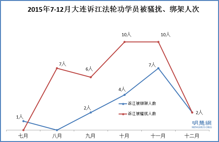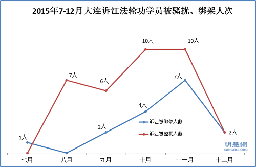 二零一五年全年大连地区遭绑架的法轮功学员有一百二十八人,被冤判及劫持入狱的有三十四人,非法庭审十七人。家属被致死一人。