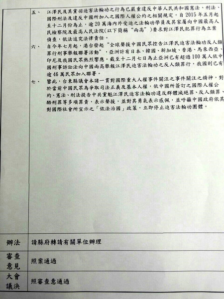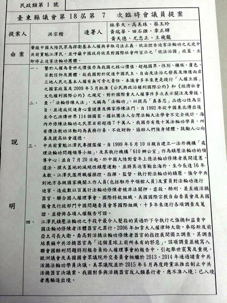 该提案强调:中共政府应依其对国际社会所宣示之“依法治国”政策,立即停止迫害法轮功团体。这也是继高雄、台中、云林、花莲、宜兰议会之后,台湾第六个县(市)议会跨党派议员共同声援中国民众控告迫害元凶江泽民。