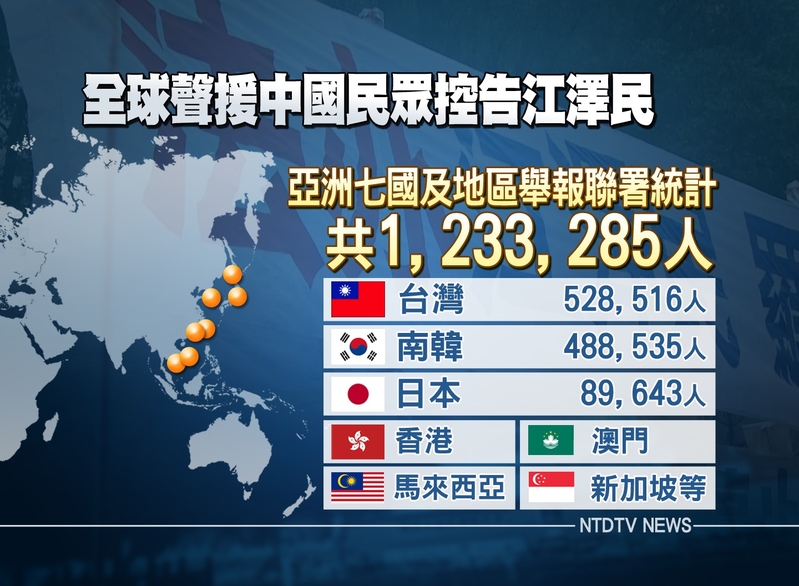 从去年七月一日到今年一月二十三日约七个月来,“举报江泽民联署行动”共获得台湾、韩国、日本、港澳、马来西亚、印尼及新加坡等七个亚洲国家与地区1,233,285民众热烈响应,其中台湾528,516、南韩488,535、日本89,643三地最多,其它印尼、新加坡、马来西亚及港澳地区也有超过十多万人联署举报;这七个国家及地区并持续将举报书寄往中国最高人民检察院及最高人民法院要求立案、起诉江泽民。