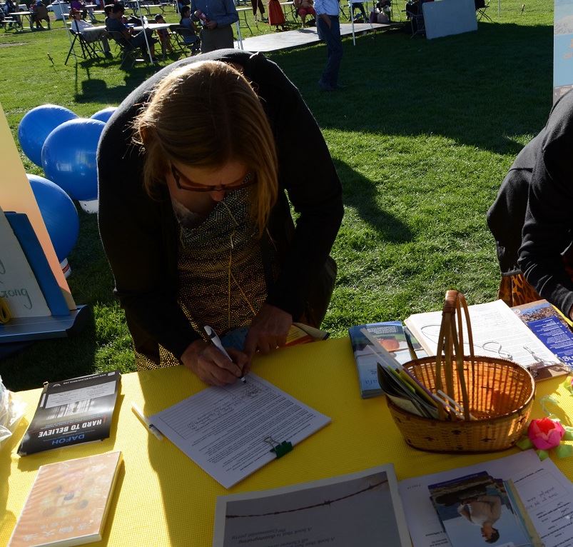 一天中法轮功的展位前人流不断,几乎所有听过法轮功学员介绍的游客都在征签表上签名表达对法轮功学员反迫害的支持,有的表达感谢提供的信息,有的表示中共活摘法轮功学员器官完全没有人权。