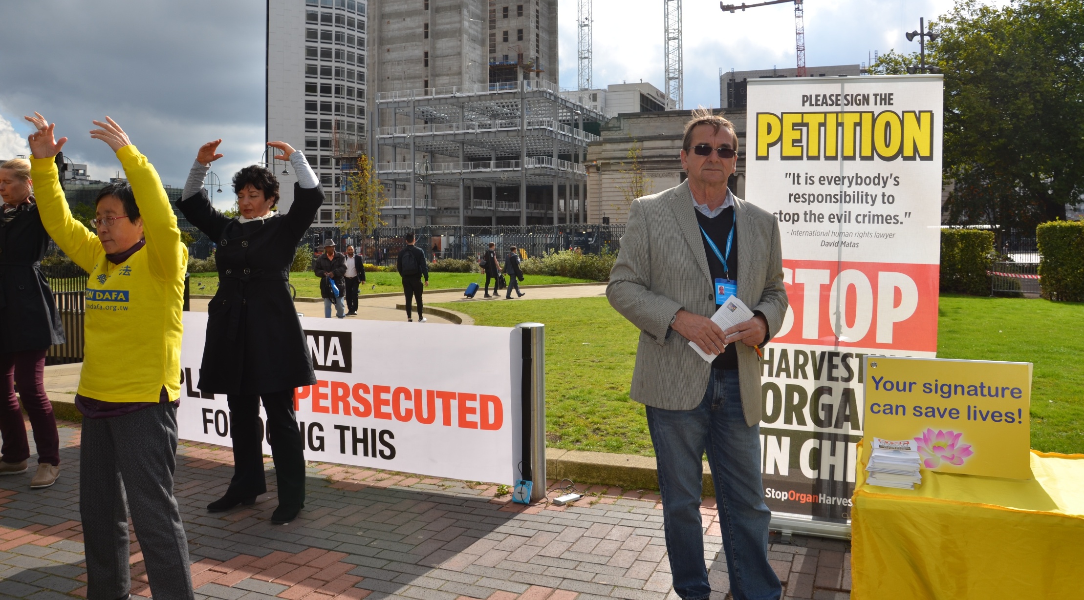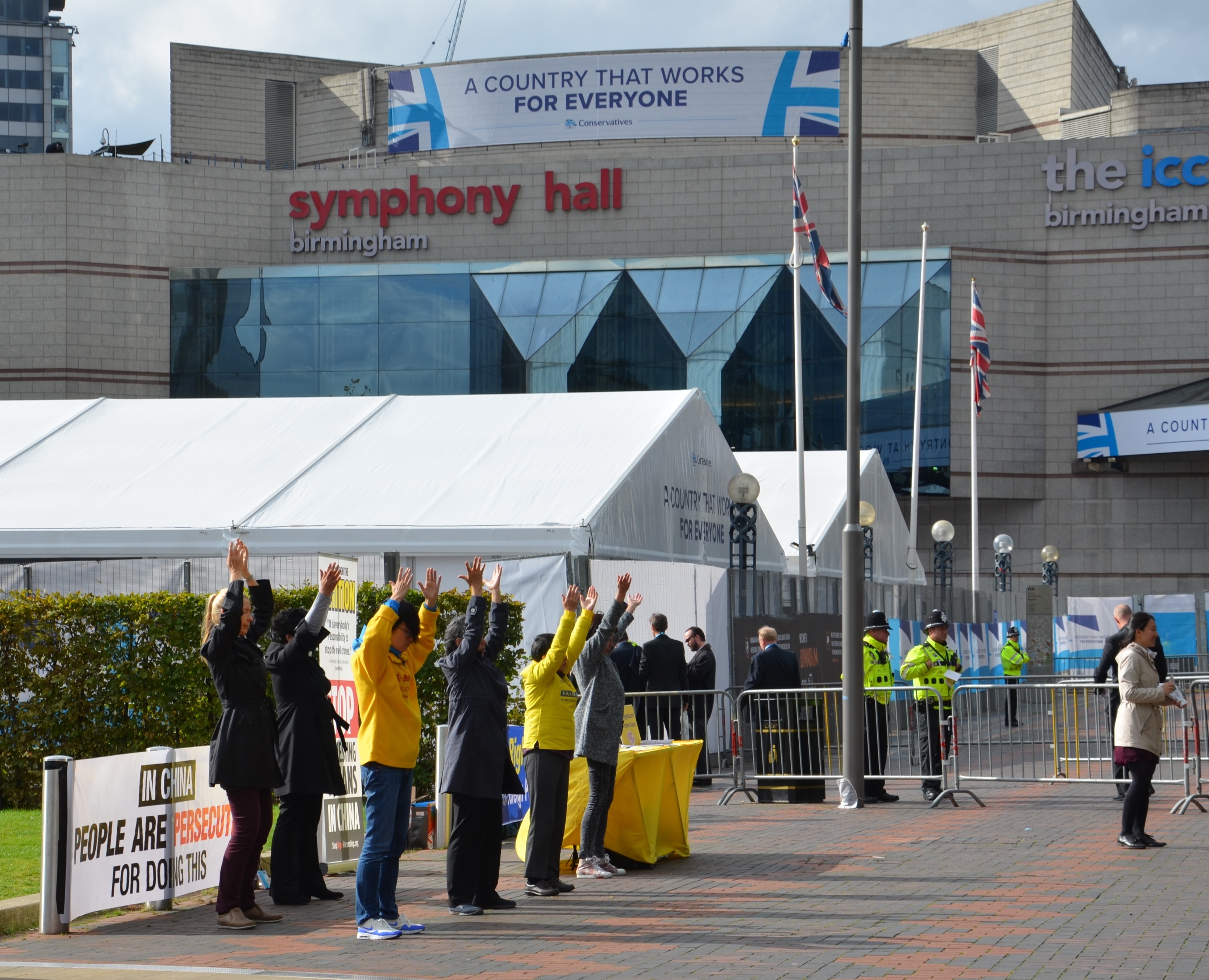 ![]() 图1:英国执政党召开党代会年会期间,英国部分法轮功学员在会场外集体炼功,揭中共活摘罪行。 |
