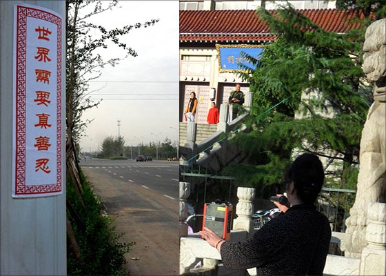河北张家口市怀来县街头的真相展板;山东蒙阴民众在集市上看法轮功真相资料;湖北省荆州地区某乡村出现真相展板