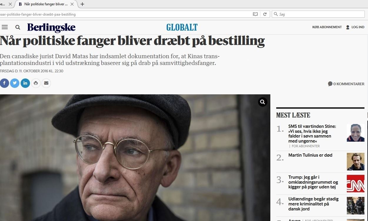 【明慧网二零一六年十月十四日】二零一六年十月十二日,丹麦三大日报之一、已有二百六十多年历史的老牌丹麦报纸《贝林报》(Berlingske)发表了该报记者安德森(Mikkel Andersson)署名的两篇文章:“当政治犯被按需杀戮时”和“信仰者被当作器官库”。