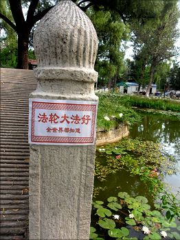 来到这景点,这里没有了中共的血旗、没有了中共的红歌,取而代之的是,映入眼帘的“世界需要真善忍”真相贴,一声“来自深穹的呼唤”娓娓传来,真相喇叭中一曲曲《为你而来》、《思故国》、《得度》等法轮大法弟子创作的歌曲传向前来观景的游人。路过的人们相互传递着这关于法轮功的信息。只是还隔着一段距离,人们默默的、远远的倾听着。