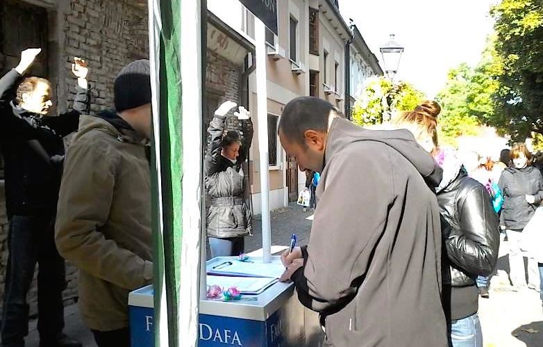 ![]() 图1:学员在演示功法,了解真相的民众在签名支持法轮功 |