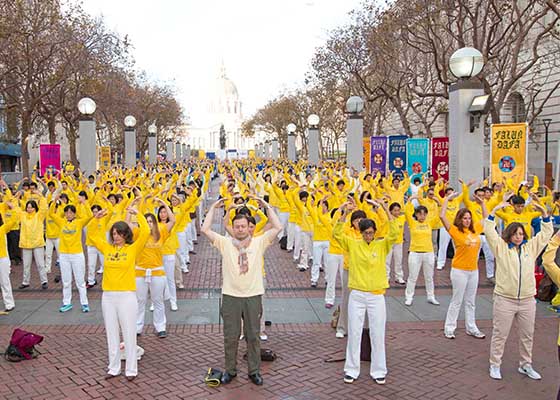 十月二十二日上午,约三千位来自世界各地的法轮功修炼者,汇集在旧金山联合国广场集体炼功,宏大场面吸引着过往的路人。