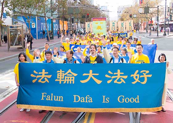 队伍行经旧金山著名的商业区联合广场以及华人店家林立的唐人街,很多来自世界各地的游客都幸运地成为法轮功游行的观众。