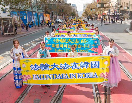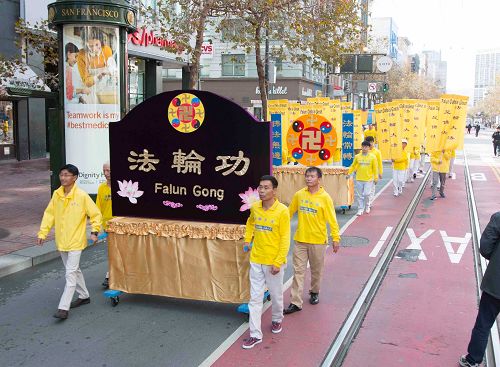 上午十一点三十分至下午二点三十分,约四千名法轮功学员在旧金山的联合国广场 (UN Plaza) 集合,开始大游行。队伍从联合国广场出发,沿Market街,往北途经市中心联合广场(Union Square) 的商业和购物区,以及中国城的主要街道,到花园角公园结束。