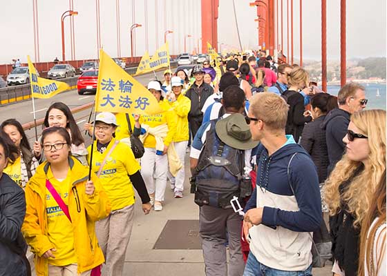 一千多名法轮功学员高举真相展板徒步穿过三英里长的金门大桥,游行让很多有缘民众听闻法轮功、感受法轮大法美好、了解法轮功反迫害真相。