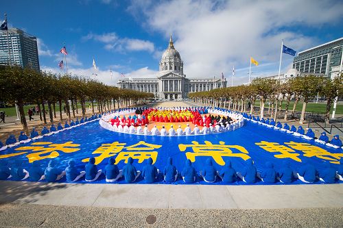 图1: 旧金山市政厅前的广场上排出壮观而神圣的“法轮图形”图像和“法轮常转”字样