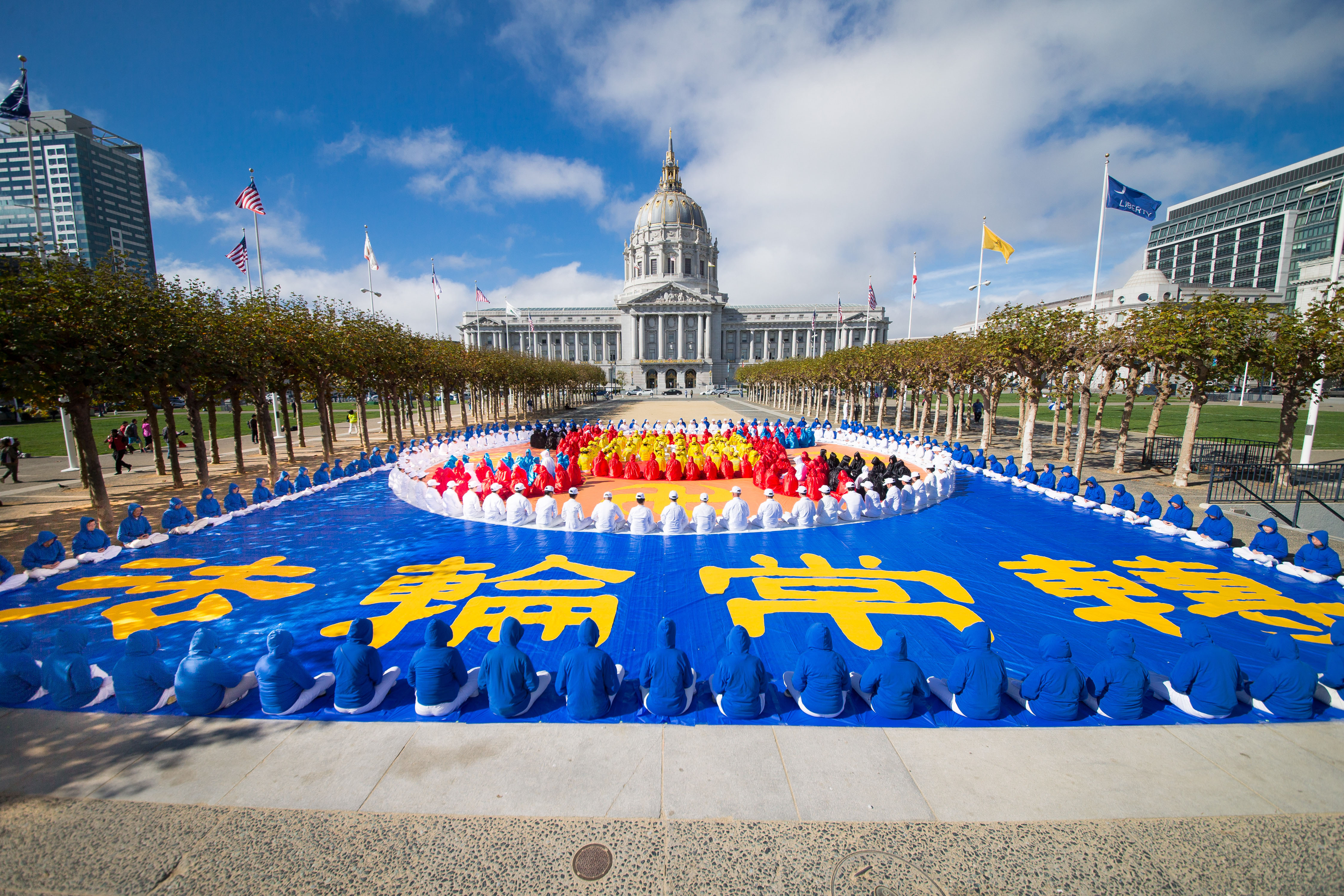 【明慧网二零一六年十月二十四日】(明慧记者华清、德祥美国旧金山报道)二零一六年十月二十三日,美国西部法轮大法修炼心得交流会前夕,数百名法轮功学员在旧金山市政府广场上排出壮观而神圣的“法轮图形”图像和“法轮常转”字样,以及“真善忍”字样。