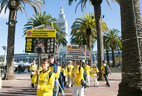 图4-6:二零一六年十月二十三日,二千名法轮功学员分散在旧金山的各景点、商业街举办小游行,揭露中共活摘法轮功学员器官的罪恶,并征集签名呼吁帮助制止迫害。