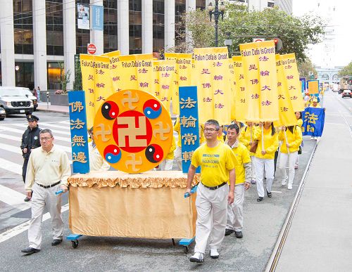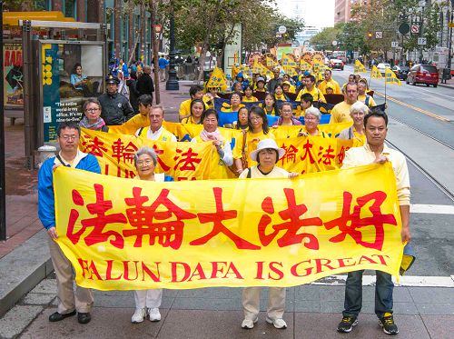 ![]() 图1-15:二零一六年十月二十五日,二千多法轮功学员举办游行,从JustinHermanPlaza附近的Market街出发,途径繁华的金融区、商业购物区,最后到达旧金山市政广场,告诉人们“法轮大法好”。 |