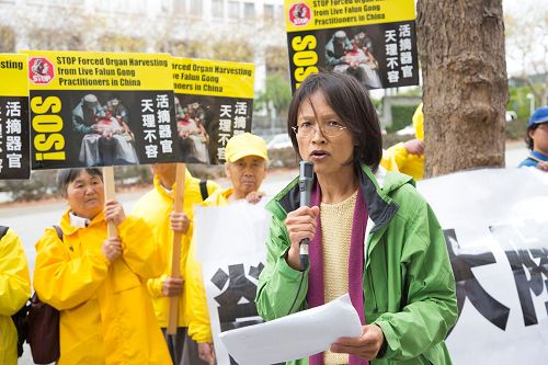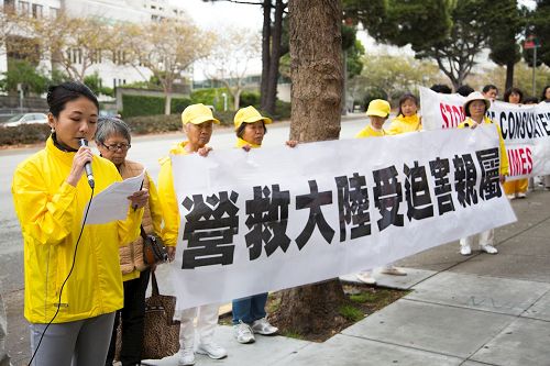 ![]() 图7:旧金山的法轮功学员王潇在集会上揭露中共非法迫害父亲、母亲及弟弟的经历。 |