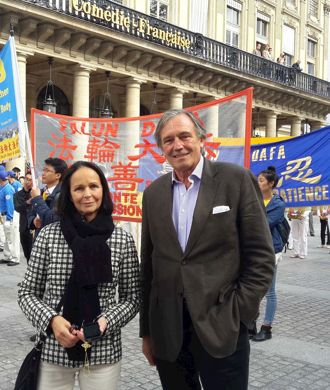图11:Marie-José Marie-José(左)是画家,她认为法轮功的游行很好,很平和,与巴黎其它游行不同。