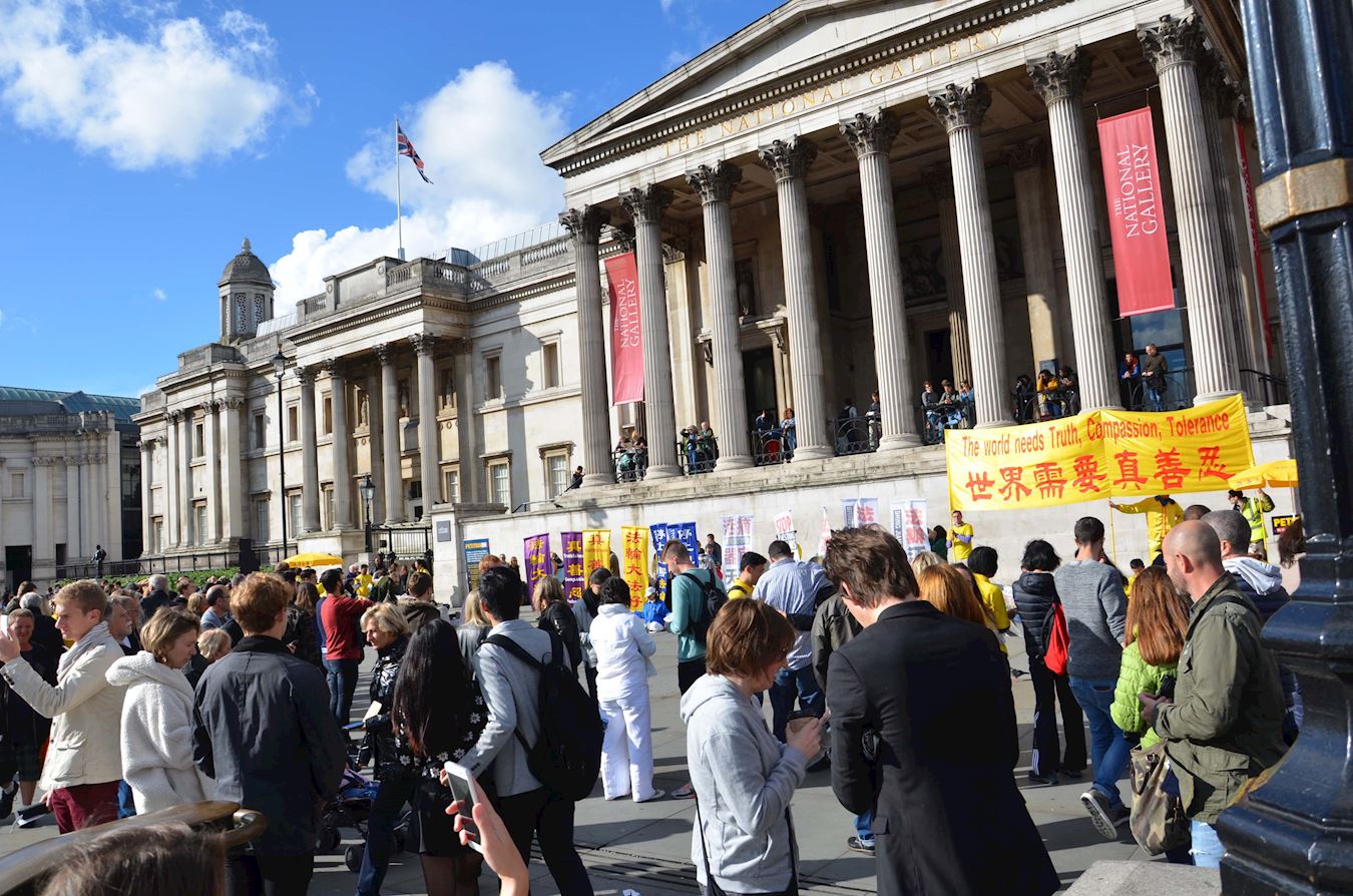 游行结束后,法轮功学员在特拉法加(Trafalgar Square)北平台举行了近五个小时的集体炼功和讲真相活动,并结合DAFOH提议设立的“反强摘国际日(October 1st as International Day Against Forced Organ Harvesting)”活动,重点向民众讲清中共活摘器官的罪行及其背后的中共自一九九九年七月以来残酷迫害法轮功的真相,明白真相的民众纷纷签名反活摘。