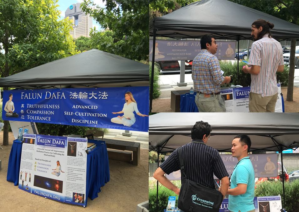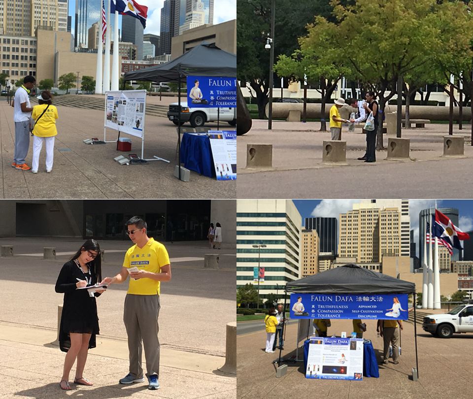 ![]() 法轮功学员在达拉斯市政府广场上举办法轮大法信息日活动 |