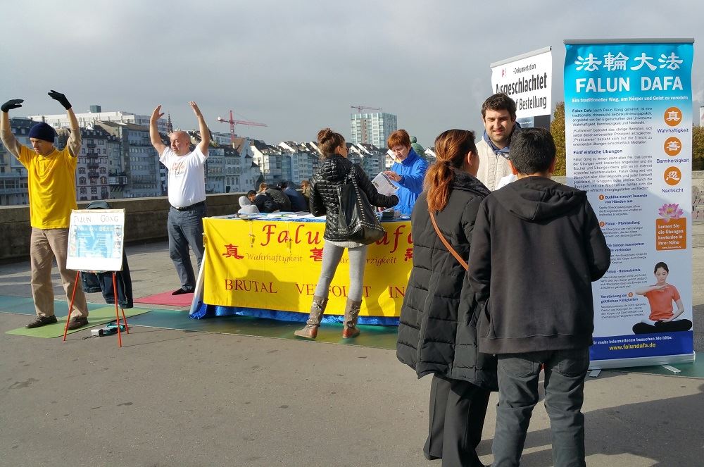 活动地点设在莱茵河桥头,两个大商业区的必经之路上。举办活动当日恰逢巴塞尔秋季贸易展览会期间,来了不少中国大陆参展商。历史悠久的巴塞尔大学有上百名中国大陆留学生。这天在大街上,信息台前遇到一些中国人:有留学生,有过来做生意的,有在瑞士定居的,也有游客。其中不少人明白真相,也有人是当天听了法轮功学员讲真相后做了三退(退出中共的党、团、队组织)。