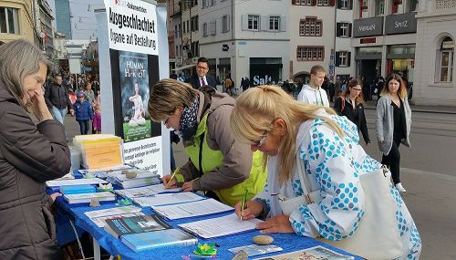 ![]() 图2-3,游客在瑞士巴塞尔(Basel)的法轮功信息日上签名反迫害 |