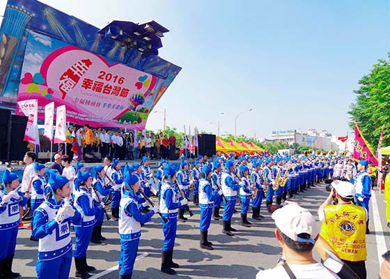 两百多位台湾法轮功学员组成的天国乐团、腰鼓队、仙女队再次应邀参加由台湾彰化高中狮子会主办的“幸福台湾节”的踩街健行活动。
