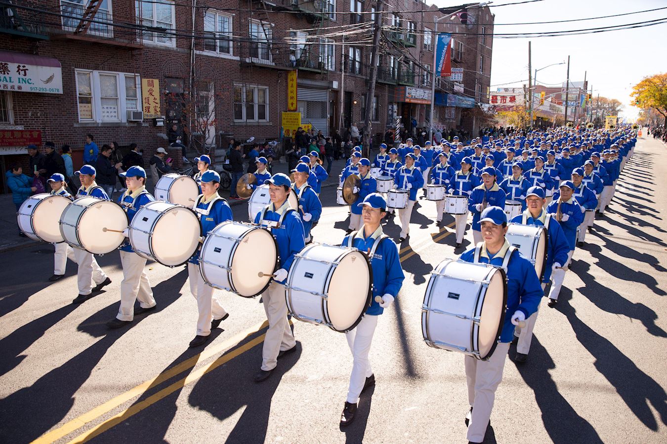 ![]() 图1-2:感恩节前,纽约部份法轮功学员沿着布鲁克林八大道最繁华的路段举行游行,天国乐团走在游行队伍最前方 |