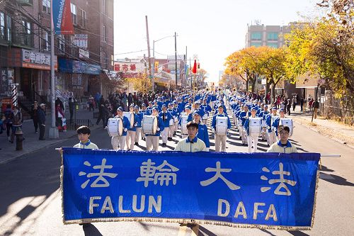 图1-2:感恩节前,纽约部份法轮功学员沿着布鲁克林八大道最繁华的路段举行游行,天国乐团走在游行队伍最前方