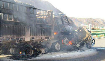 恶报案例:孟兆庆,甘肃省宁县“610办公室”主任,2011年12月23日上午11时,乘坐宁县法院面包警车在高速路上行驶时钻入拖车前底部,油箱起火,引燃大车,火借风势,瞬间吞噬两辆车,孟兆庆当场死亡。(网络图片)
