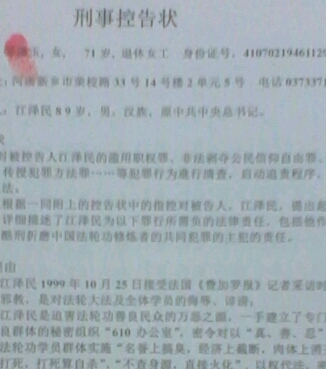 自二零一五年五月以来,河南省新乡市法轮功学员纷纷用实名向最高法院、最高检察院控告迫害法轮功的元凶江泽民,要求逮捕法办江泽民。到目前为止新乡市辖区至少已有369人真名实姓控告江泽民,绝大多数已被两高院签收,当地民众表示支持控告和愿意参与举报江泽民的,并且已被两高签收的目前已达1654人。
