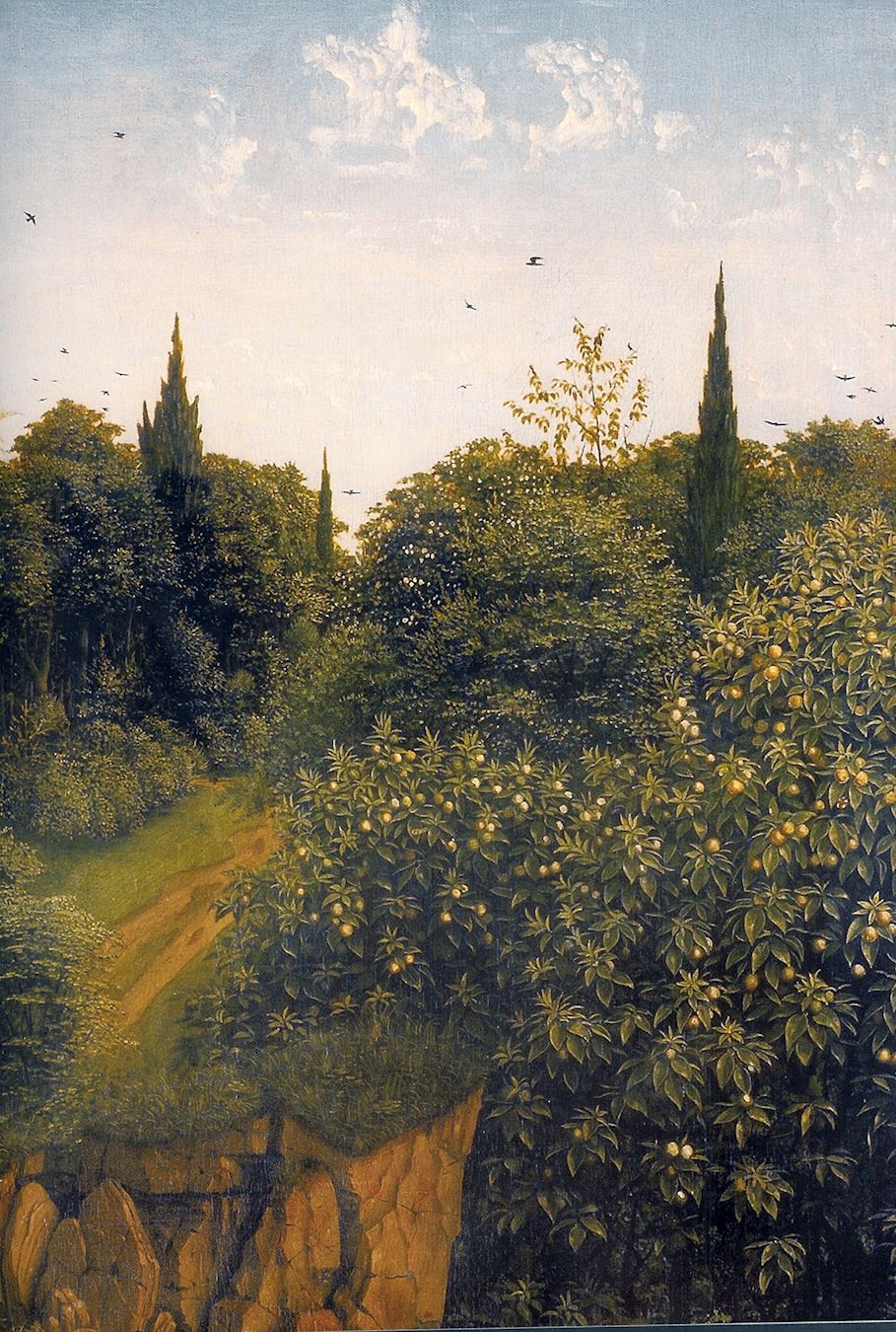 图例:凡·艾克兄弟的《根特祭坛画—神秘的羔羊》(《Retable de l'Agneau Mystique》),作于 1415年—1432年,整幅祭坛画约343×440厘米,题材取自圣经《启示录》,表达了对神在末世时慈悲救度众生的赞颂。画中树脂油多层罩染技法的出色运用与静谧精细的写实风格让此画成为油画史上最为重要的杰作之一。