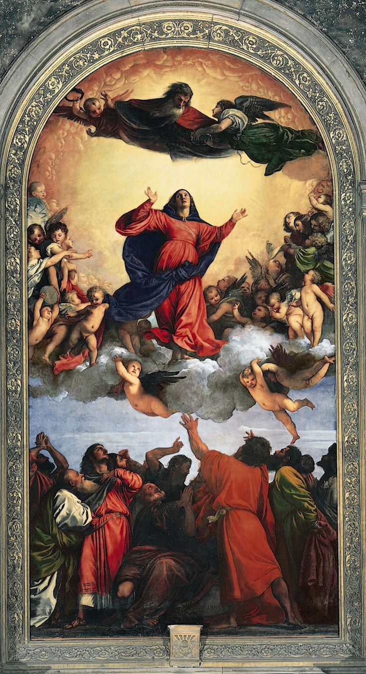 '图例:威尼斯画派代表画家提香的《圣母升天》(《L'Assomption de la Vierge》),木板油画,690×360厘米,作于1516年—1518年。由于画家优秀的底层提白技法,这幅名画虽然历经五个世纪的沧桑,但仍然呈现出明亮鲜艳的色彩效果。'
