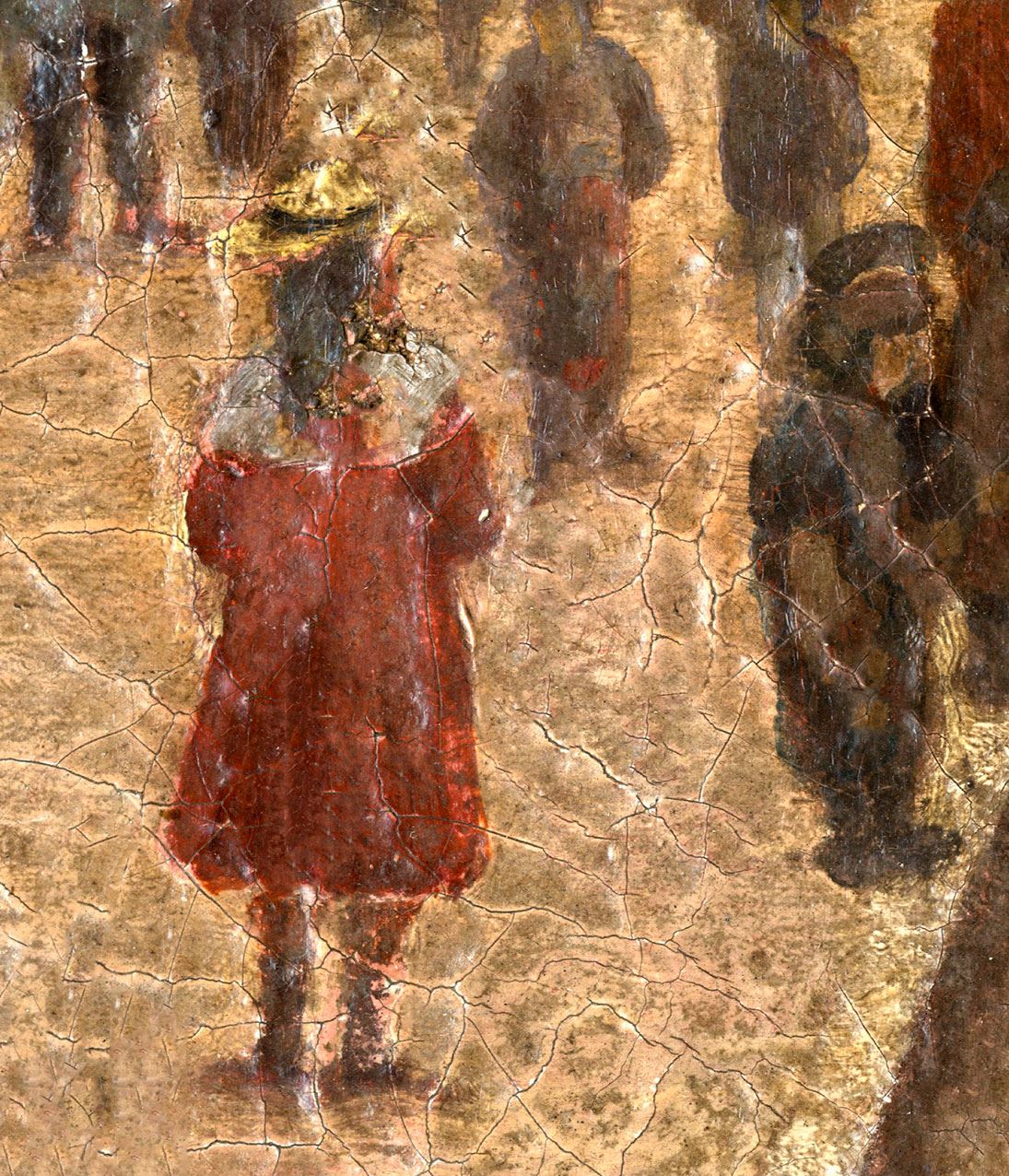 图例:印象派油画《布里昂松市大雨漏街的活跃街景》(Vue de Briançon avec une vue animée de la rue de la Grande Gargouille)局部。此画作于1870年左右,作者不详。可以看到画面因技法不合理已经严重变色开裂。