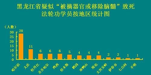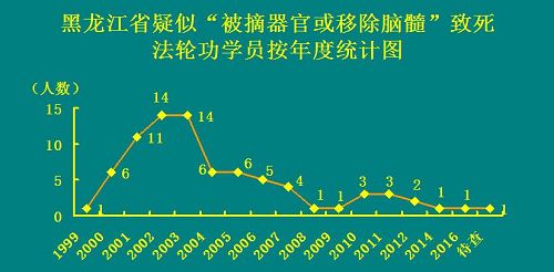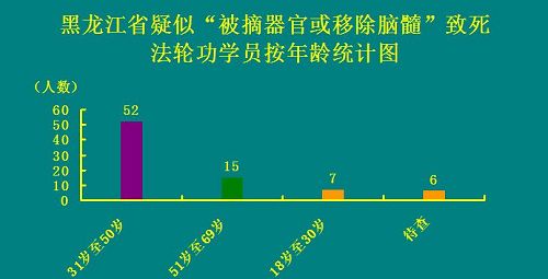 据突破封锁由明慧网报道出来的消息,至少四千多名法轮功学员被迫害致死,其中黑龙江省就有527人,其中至少有80位法轮功学员的器官被野蛮移除,贩卖或做他用;这些学员的平均年龄为43岁;被致死的表现形式——被脑出血、被跳楼、被自杀、被灌食、被犯人打死、被抢救等。