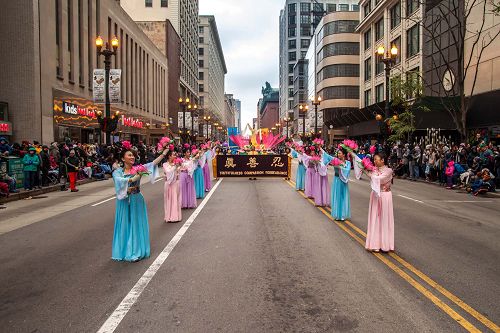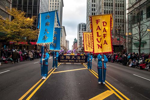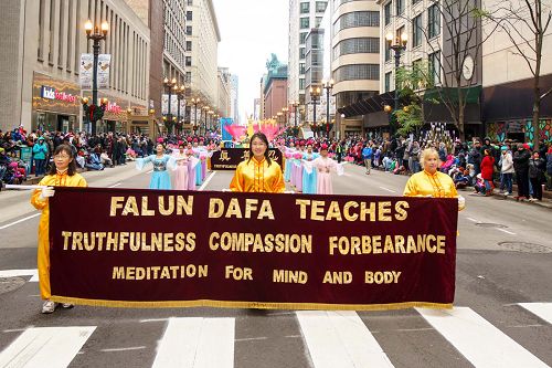 【明慧网二零一六年十一月二十六日】二零一六年十一月二十四日,芝加哥迎来第八十三届感恩节“麦当劳”大游行。这是芝加哥规模最大的节日庆典游行,今年吸引了四十万现场观众,并通过电视实况直播,拥有多达三百五十万的电视观众。参加者是组委会从众多申请者中严格筛选出的上百个团体。巨型气球,乐队、马队、花车以及各种多姿多彩的表演队伍,阵容华丽庞大。