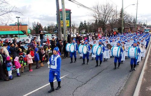 来自北京的王女士和先生手拿着圣诞老人送的小旗子,看到天国乐团来到时,挥着小旗子说:“欢迎,欢迎,真好!真棒!”王女士和先生挥着旗子跟着队伍走了一段路才停下来,王女士用三个“最”来形容:“法轮功的乐队是所有游行中最好看、最壮观、最整齐的。我们到加拿大有好几年了,我们很喜欢看这里的游行,后来发现好象哪的游行都有法轮功队伍,而且非常受欢迎。作为中国人,看到这样令人振奋的场面我都感觉特自豪。”