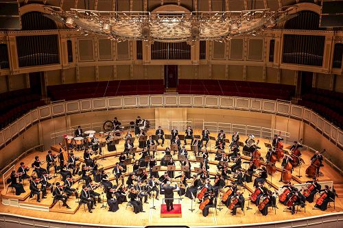 二零一六年十月二十九日下午,在金碧辉煌的芝加哥交响中心大厅内,全场观众起立持续不断的鼓掌,感谢神韵交响乐团的音乐家们的精彩演出。