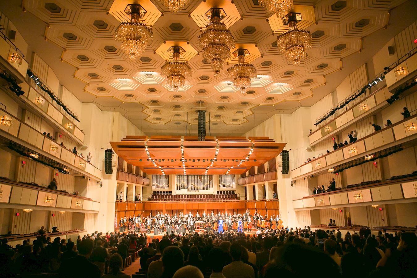 图1:二零一六年十月二十九日下午,神韵交响乐团在金碧辉煌的芝加哥交响中心大厅内的演出。