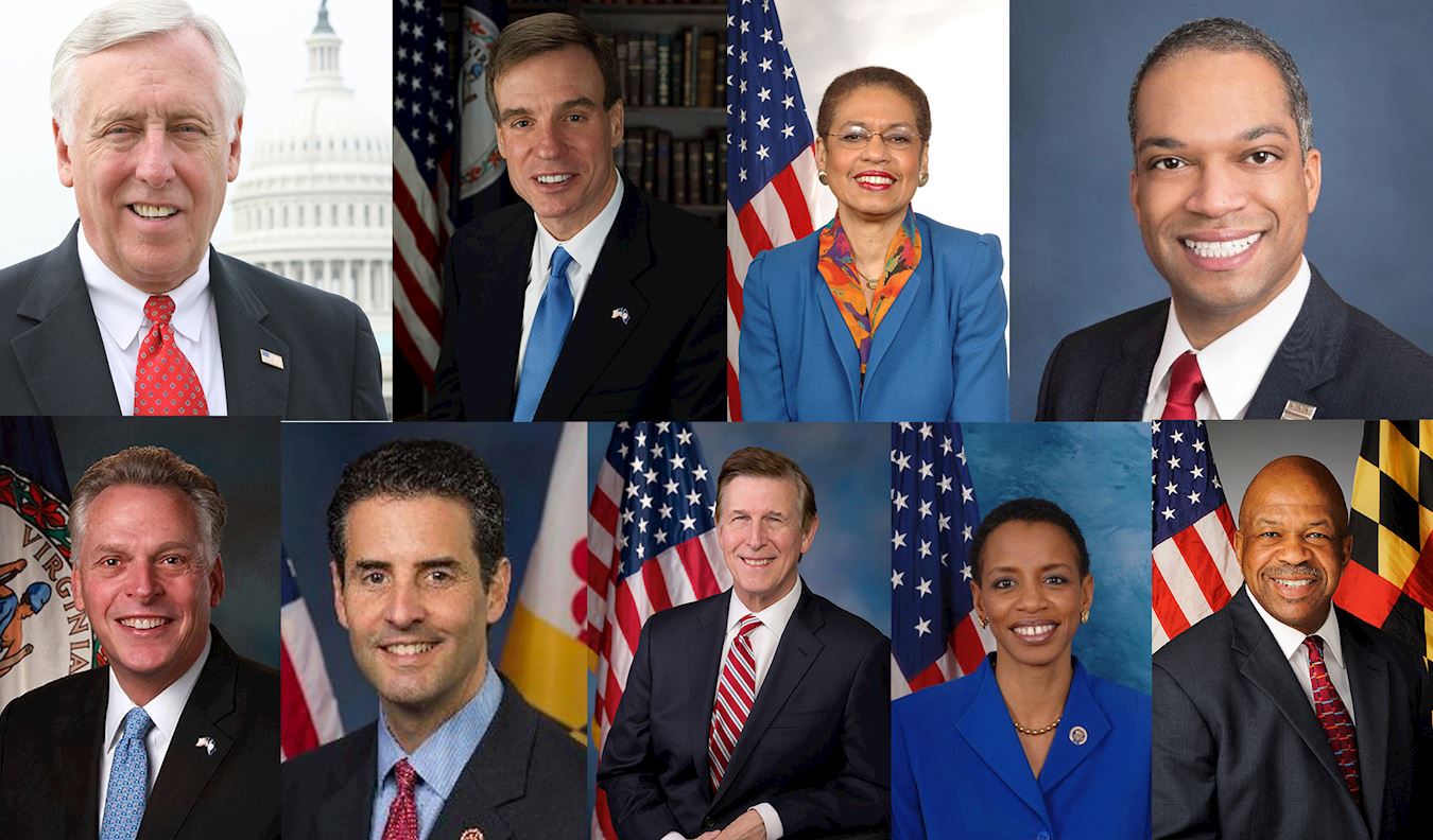 上排从左到右:美国国会众议院少数党领袖、联邦众议员霍耶(Steny Hoyer),维吉尼亚州联邦参议员马克.华纳(Mark R Warner),美国华盛顿哥伦比亚特区联邦众议员埃莉诺‧霍姆斯‧诺顿(Eleanor Holmes Norton),美国华盛顿DC市议员布兰登.托德(Brandon Todd)