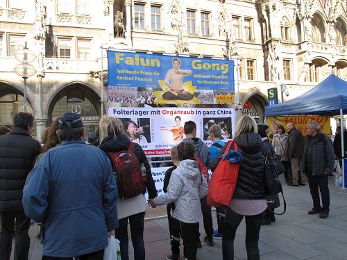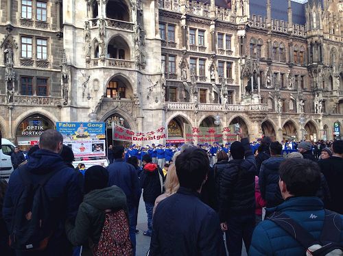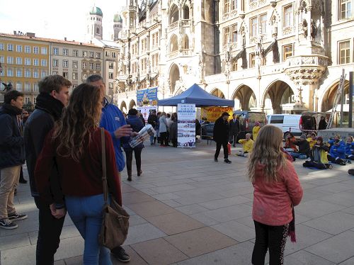 玛利安广场是慕尼黑老城区的心脏,至今保有慕尼黑市的中心地位,是慕尼黑新、旧市政厅所在地,也是游客必到的地方。法轮功学员当天的活动让这个著名的广场成为传播法轮功真相的大舞台,从早晨十点到晚上八点,法轮功学员以多种形式传递的真相信息遍布整个广场。与平日熙熙攘攘的人流、喧闹嘈杂的人群不同,人们今天在这里感受到法轮大法的美好、法轮大法“真善忍”修炼者的平和能量,更被中共的邪恶罪行所震惊。