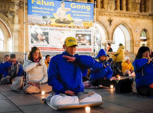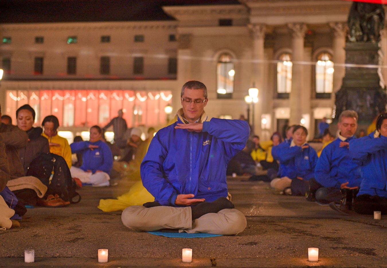'图1:十一月四日晚,法轮功学员在玛丽亚广场举行烛光守夜活动,呼吁世人帮助制止迫害。'