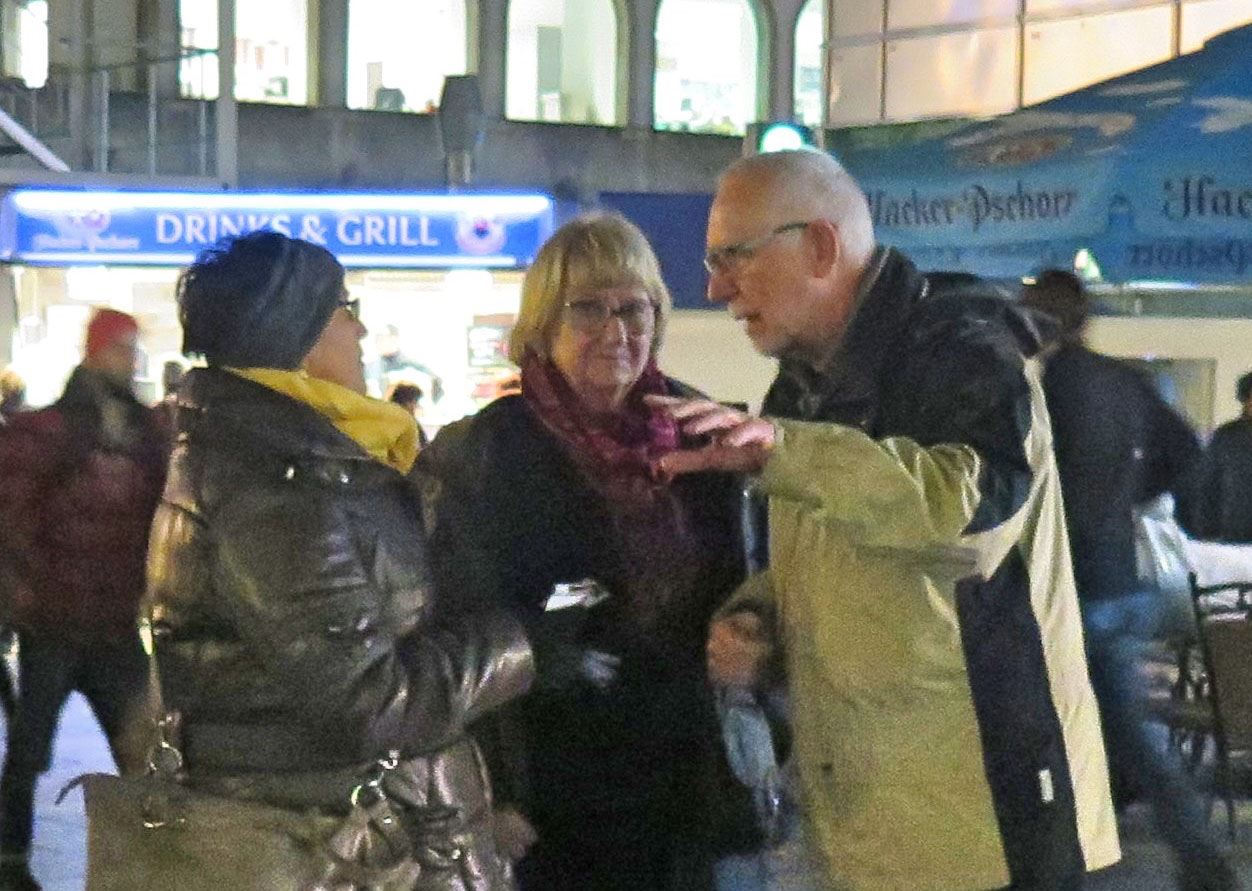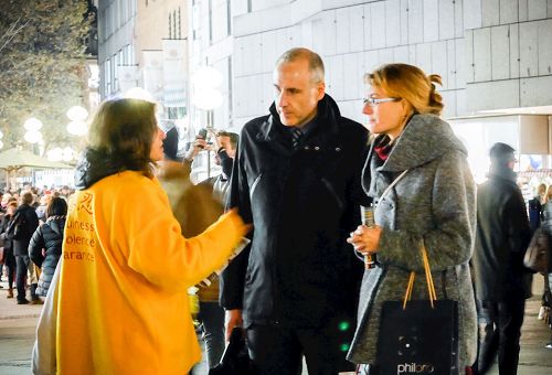 十一月四日,在玛丽亚广场上,从法国到慕尼黑看望在这上学的女儿的埃琳娜(Elena)和她的丈夫遇到了法轮功学员举办烛光守夜活动。倾听了法轮功学员介绍中共如何毫无人性地残酷迫害法轮功学员的介绍后,这对法国夫妇感到震惊,他们无法理解在今天的社会竟然还会发生这样的事情。他们说:“我们回去以后要好好研究这件事。”